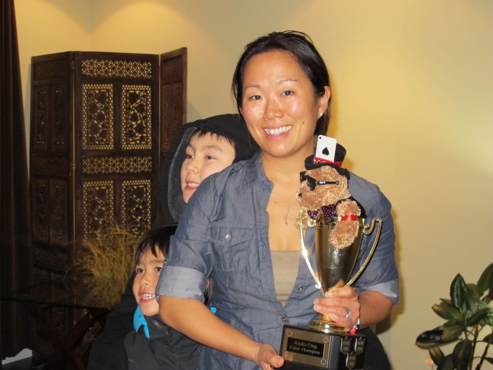 Since my memory is poor, I can’t remember any knockout hands, though I do remember precisely when my bad luck turned. I was on the brink of elimination when I rivered a 9 or something to catch two pair and tripled my chip count. I nearly got extinguished again by a formidable female player who always seems to have my number, but somehow I smartened up and tightened up my play with her. I also remember that I accidentally knocked out my husband, so that he finished in 4th place (like I said, I was to his lucky left), but in retrospect it was a good thing for me, as he knows my playing style the best and I’m sure, would have beat me in heads up.